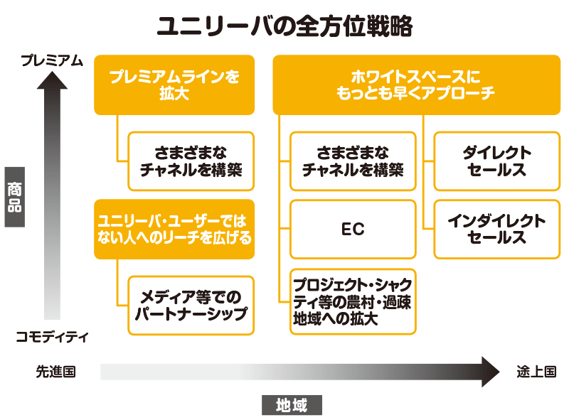 2019年6月に、日本文化に着想を得た米国のD2Cブランド「タチャ(TATCHA)」の買収発表で美容業界を驚かせた。2015年以降、韓国の有力ブランドであるカバーコリアなどビューティ関連で14件と立て続けに買収を行ってきているユニリーバを分析すると、途上国と先進国の両方を、低価格帯から高価格帯までの製品をそろえることで獲得する全方位戦略をとっていることがわかる。また、スマートラベル(SmartLabel)で香料成分を法令以上に開示したり、広告の透明性、信頼性にブロックチェーン技術を活用するなど、利便性よりも倫理やサステナビリティへのデジタル投資を積極的に行っている。