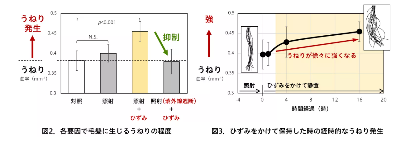 実際の生活では、日中外出すると太陽光にさらされ、就寝時には枕との接触で毛髪がひずんだ状態のまま時間が経過するなど、複数の要因の影響が頭髪表層に集中すると考えられる。これらを考慮して評価した結果、太陽光照射のみでは毛髪形状に有意な変化はみられなかったが、照射後、毛髪をひずんだ状態で保持すると顕著にうねりが発生し(図2)、保持時間が長いほどうねりが強くなった(図3)。一方で、太陽光から紫外線を遮断するとうねりの発生が抑制されたことから、紫外線とひずみがうねり発生の大きな要因であることを見いだした。