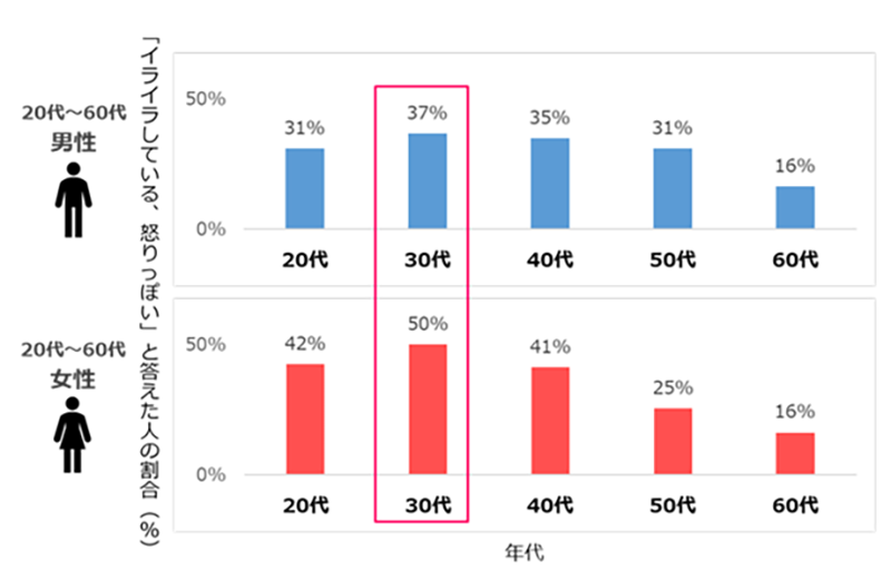 20代から60代の男女で比較したところ、男女ともに30代において、「イライラしている、怒りっぽい」と回答した割合が最も高かった。特に30代女性においては50%と、約2人に1人が「イライラしている、怒りっぽい」状況であることが分かった。
