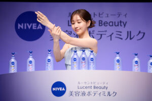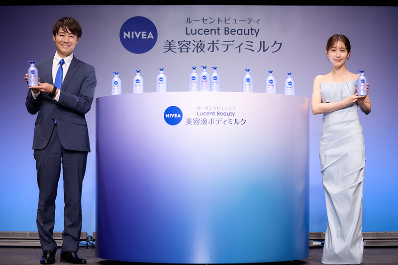 9月10日には、「ニベア ルーセントビューティ 美容液ボディミルク」発売記念PRイベントを開催。冒頭では、ニベア花王 マーケティンググループの小柴佳介ブランドマネージャーが登壇。「日本の女性の約8割がニベアを使用した経験があり、ボディケア市場でもシェアNo.1を維持しています。近年はボディの肌にも透明感やハリを求める消費者が増え、フェイスケア級の成分を求める声が強まっています。そこで、ボディにも美容液をという新提案を形にしました」と市場背景と開発意図を説明した。