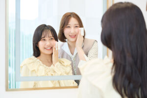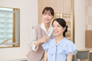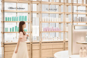 新店はOMOYA(母屋)とHANARE(離れ)の二つのエリアに分かれている。OMOYAは、アルビオンの王道である最上の接客により高品質な商品を体験してもらう売り場だ。例えば、21種の乳液を同時展示する「MILK BAR」に加え、最旬の商品情報の発信、スキンケア・メイクを自由に体験できるコーナーを用意。人目を遮った空間で、肌に寄り添ったカウンセリングやミスト美容が体験できるのも特徴だ。