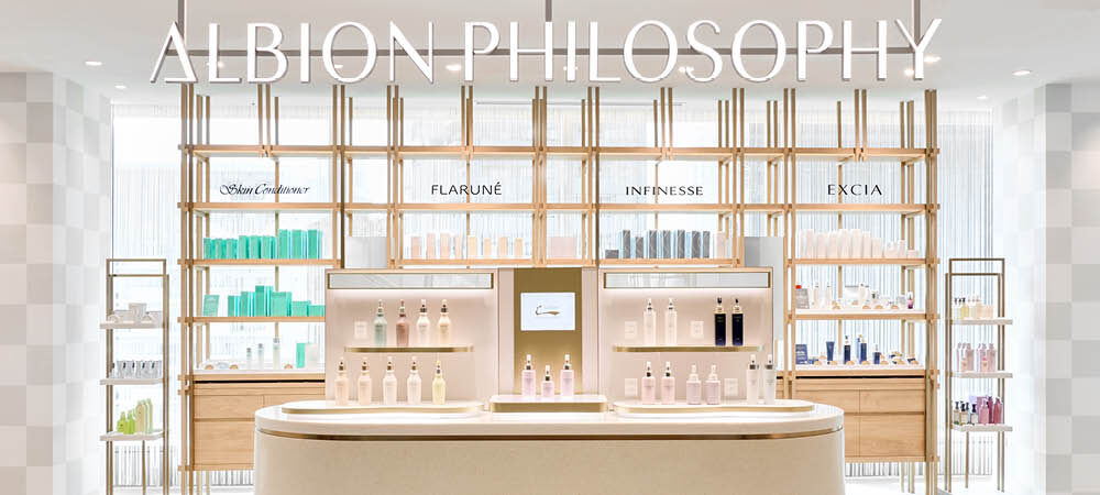 「ALBION PHILOSOPHY(アルビオン フィロソフィ)」は、アルビオンの哲学である「ものづくり」と「お客さま最優先の接客」を体現する旗艦店で、1号店のNEWoMan横浜店に続く新店が2025年9月12日にオープンした。場所は山手線・高輪ゲートウェイ駅直結のNEWoMan高輪サウス4階で、エスカレーター前の好立地。アルビオンを象徴する21種の乳液の紹介にフォーカスし、30代、40代を中心に新客を獲得する考えだ。アルビオン営業本部業態開発事業部の坂本一裕ゼネラルマネージャー兼業態企画グループグループ長は「従来のOne on Oneの接客だけではなく、アルビオンらしい新しい価値の伝え方に挑み、年商3億円を狙います」と意気込んでいる。