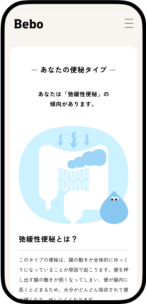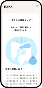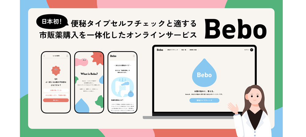 そうした背景から、エムボックスは便秘タイプのセルフチェック、症状に合った市販薬を提案、そのままオンラインで購入まで完結できる新サービス「Bebo」を開発した。主な機能は、利用者が設問に回答することで自身の便秘タイプの傾向を推定し、その結果に基づいて提案される市販薬を選択・購入すること。設問と回答ロジックは、すべて消化器内科専門医によって開発・監修されており、医学的根拠に基づいた適切な便秘ケアを提供する。