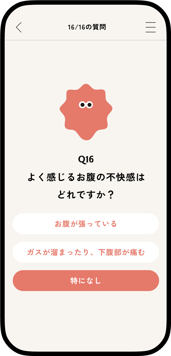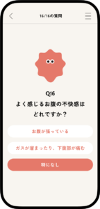 問診票レベルの最大16問の設問をもとに、症状や体質のセルフチェックを支援。結果は「けいれん性便秘」「弛緩性便秘」「直腸性便秘」「薬剤性」「その他」「便秘ではない」の全6タイプに分類され、一人一人に合わせたケアの方向性を提示する。