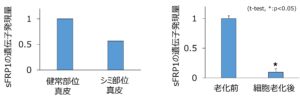 シミ部位における「sFRP1」の遺伝子発現量と、細胞老化後の「sFRP1」の遺伝子発現量