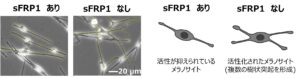 次に、シミ部位の真皮で減少していた「sFRP1」が実際にシミ形成へどのように関与するのかを明らかにするため、メラノサイトや3次元皮膚モデルを用いた機能解析を行った。まず、メラノサイトにsFRP1を添加することで、メラノサイトの活性化状態の指標である、樹状突起の形成が抑制されることを確認した(図5)。