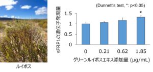さらに、真皮の線維芽細胞において「sFRP1」の産生を高める成分の探索を行った。数ある植物エキスのうち、南アフリカ原産のハーブであるルイボスの未発酵の全草から得られるグリーンルイボスエキスに着目した。グリーンルイボスは通常の発酵ルイボスに比べてポリフェノールを豊富に含むため、抗酸化作用や抗炎症作用による美肌効果が期待され、飲用としても親しまれている。グリーンルイボスエキスを線維芽細胞に添加した結果、sFRP1の発現が有意に上昇することを確認した(図6)。