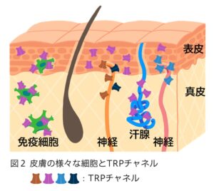 ・TRPチャネルが、「ポリモーダル(多様な刺激によって変化する)受容体」として、皮膚に存在するさまざまな細胞で多様な発現パターンを有すること