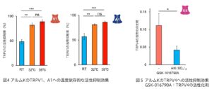 アルムKについては、既に同グループが明らかにしている痛みセンサーTRPV1、A1の活性抑制作用が高温になる程大きくなることを見いだした(図4)。加えて、アルムKは汗腺に存在し汗を制御すると言われているTRPV4の活性も抑制する作用があることを明らかにした(図5)。これは、アルミニウムが古くから制汗剤として利用されてきた理由の一つである可能性がある。