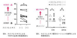 さらに、約2700種の化合物からTRPV1を抑制する成分を探索した結果、特定の成分が含まれたカミツレエキスに有効な作用を見いだした。同エキスを配合したモデルローションの連続使用試験では、刺激感の低減が確認できた。この成果は、環境ストレスにより過敏な状態になった肌を安定させ、快適な使用感を実現する新しい敏感肌ケアの提案へつながる。