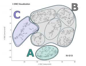 Walk Coordinator技術を搭載したアプリを使うと、わずか8歩の歩行から骨盤角度・関節角度・関節モーメントの左右差や可動性などを測定できる。このアプリを用いて、23年に919人のデータを取得し※2、歩行時の身体アライメントの非対称性に関する52項目を機械学習で整理。身体アライメントのゆがみの程度で分類したマップを作成した※3。このマップは、52項目から計算された一人一人の身体アライメントのゆがみ特徴に基づいてプロットしており、位置関係が近いほど特徴が似ていることを示している(図1)。