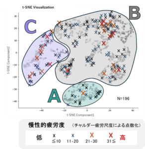 24年に実施した歩行測定によって196名をA~Cタイプのいずれかに分類し、チャルダー疲労尺度で評価した慢性的疲労度のスコアと併せて図1に重ねてプロットした※4(図2)。
