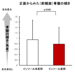 その結果、インソール未着用時には骨盤角度が平均して0.95°左右いずれかに傾いていたが、着用後には0.22°の傾きの改善が認められた(図3)。以上から、インソールを着用することで、身体アライメントのゆがみを補整できる可能性があると考えられる。