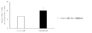 6週齢雄性ICRマウスに、大麦若葉末を含まない餌(コントロール群)、または大麦若葉末を配合した餌(大麦若葉末群)をそれぞれ3週間摂取させた。その結果、大麦若葉末群ではコントロール群と比較して、小腸パイエル板(小腸に存在する、多くの免疫細胞が集まる免疫器官)における制御性T細胞の比率が有意に高いことが確認された。
