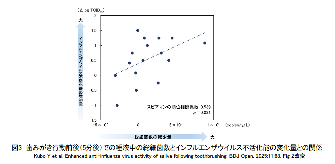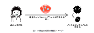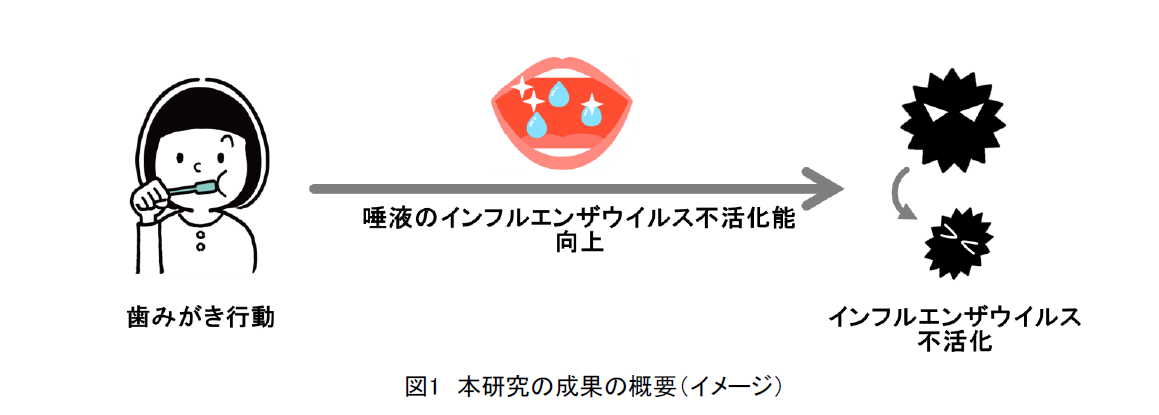 これまで、疫学調査により口腔衛生状態とインフルエンザの発症率との関連性が報告されていたが、同研究では生化学的手法により、歯みがき行動によって唾液のインフルエンザウイルス不活化能が向上することを初めて明らかにした。このことから、口腔内をきれいに保つことにより、ヒト本来の免疫力(唾液のインフルエンザウイルス不活化能)が向上し、外部から口腔に侵入するインフルエンザウイルスを不活化できる可能性が示された。口腔内の健康維持のみならず、感染症への備えという観点からも、日々の丁寧な歯みがき行動が重要であると考える。
