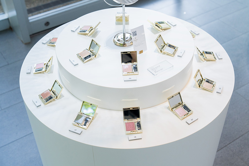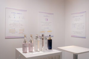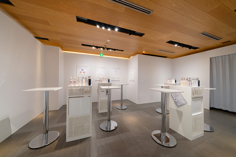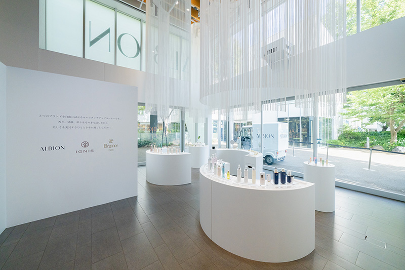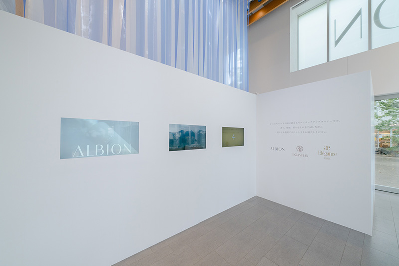 イベント会場は、アルビオンの世界観を表現するエントランスの「ブライトゾーン」、先行乳液体験を提供する「乳液ゾーン」、アルビオンの最高峰ライン「エクシア アンベージュ」を使用した丁寧なスキンケアとプロのメイクアップアーティストによるフルメイクアップが体験できる「特別体験ゾーン」、「アルビオン」「イグニス」「エレガンス」などのアイテムを自由に試すことができる「セルフタッチゾーン」の四つにゾーニング。