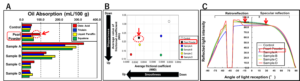 図3. 真珠パウダーの化粧品原料としての特性。A: さまざまな油種に対する粉体原料の吸着性の比較。真珠パウダー(赤色の枠線)において、皮膚老化の原因と考えられるオレイン酸に対して有意な吸着を示した(n=3, p<0.05)。B:粉体原料の摩擦特性の比較。真珠パウダー(赤色の枠線)において、赤丸で示したマイクロプラスチックパウダーと近しい摩擦特性を示し、両者の使用感が近いことが確認された。C: 粉体原料の光学特性。真珠パウダー(赤矢印)において、高いソフトフォーカス性があることが確認された。