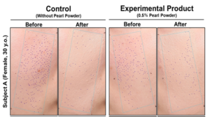 さらに、実際の化粧品に配合した際の人への特性として、リキッドファンデーションの塗布前後の毛穴の隠れ具合を確認したところ、真珠パウダーを配合した製品の方が無配合のものよりも毛穴を目立ちにくくする(メイクアップ効果による)度合いが高くなる傾向が確認された(図4)。また、製造方法においても環境への負荷が少なく、持続可能な素材としての可能性が示された。