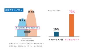 表皮角化細胞においてインフラマソームの活性化により生じた炎症を測定する細胞試験を実施した。その結果、オレオカンタールはインフラマソームの活性化を顕著に抑制し、抗炎症成分として広く知られているグリチルリチン酸と比べて約4.5倍の阻害率である73%と高い効果を示すことを発見した。