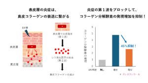 一方、紫外線を照射する前にオレオカンタールを添加していた表皮角化細胞の培地を真皮線維芽細胞に添加したところ、コラーゲン分解酵素MMP-1の発現がオレオカンタールを添付していない場合と比較して、マイナス45%と顕著に抑制されることを新たに発見し、コラーゲン分解酵素の発現増加を抑制することを明らかにした。この結果により、オレオカンタールが真皮層のコラーゲンの保護に役立つ可能性を見いだした。