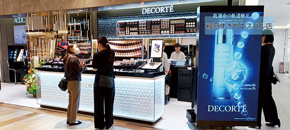 9月20日の午前10時、粧苑すきやのエスパル店にコスメデコルテのファンが殺到した。目当ては1階エスカレーター前の超一等地にできた「DECORTÉ COLOR PORT」。ファンデーションのカラーチャートを付けたオリジナル什器は、コスメデコルテのファンデーションには多様な色があることが一目で分かり、自分好みの色を短時間で選ぶことができる。接客時間の短縮という高トラフィックの駅ビル立地店の課題を軽減する仕掛けでもある。