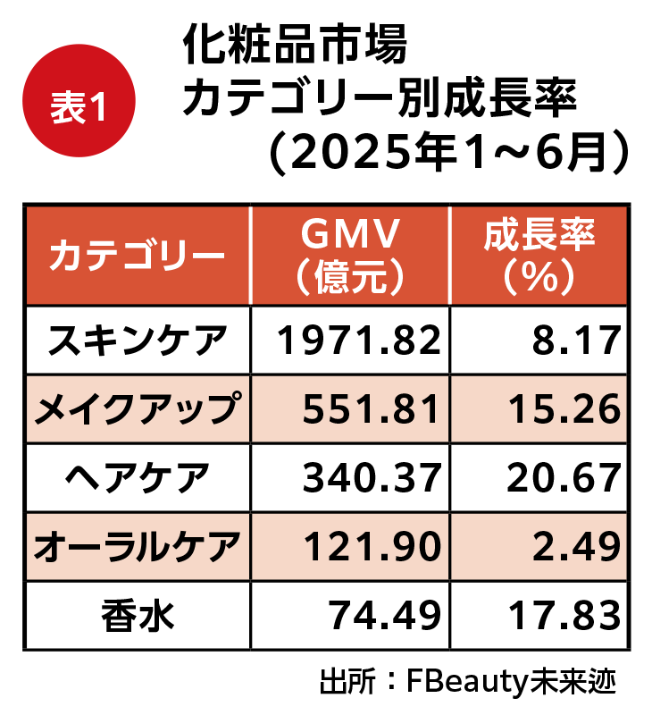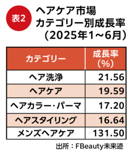 この2年間、中国におけるヘアケア市場が強い勢いを見せている。統計によると、2024年のヘアケア市場は前年比59.32%増の899億9500万元に達し、化粧品市場の中で最も成長の速いカテゴリーになっている。今年上半期だけでも、ネット上のヘアケアの成長率は他のカテゴリーを上回り、GMV(流通取引総額)は前年比20.67%増の340億3700万元となっている(表1)。ヘアケア市場のカテゴリー別成長率を見ると、メンズヘアケアが131.50%増という驚異的な成長を記録したほか、ヘア洗浄(21.56%増)やヘアケア(19.59%増)、ヘアカラー・パーマ(17.20%増)およびヘアスタイリング(16.64%増)はいずれも2桁の成長を遂げている(表2)。