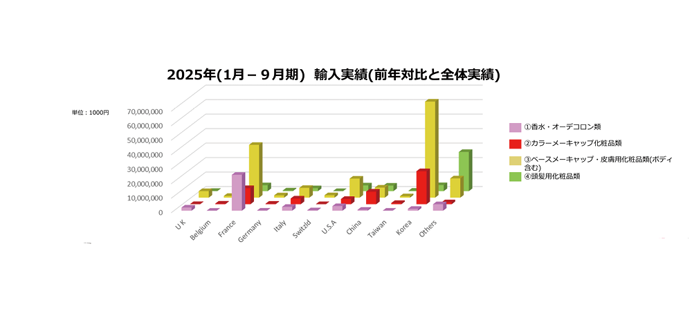 日本輸入化粧品協会は、2025年(1~9月期)化粧品輸入実績を2025年11月5日に公表した。歯磨、石鹸等は除く輸入実績は、3425.3億円(前年同期3274.4億円、前年同期比104.6%)となり、前年を上回った。今期は「香水・オーデコロン類」(前年同期比114.1%)、「ベースメーキャップ・皮膚用化粧品類」(前年同期比104.0%)、「頭髪用化粧品類」(前年同期比 101.6%)と前年を上回ったが、「カラーメーキャップ類」(前年同期比98.1%)は下回った。 国別では韓国が輸入実績1065.8億円(前年比113.2%)と好調を持続し、トップを走っている。続いてフランスが輸入実績768.3億円(前年比93.4%)となっている。韓国とフランスのシェアはそれぞれ31.1%、22.4%となっている。