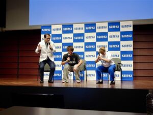 また、サッカー指導者・解説者の本並健治、タレントの丸山桂里奈夫妻が登壇。古賀氏とトークセッションを行った。本並と丸山の筋肉ケア習慣や、本並が毎日行っている筋トレのやり方について古賀先生がアドバイスするなど、意識すべきポイントを伝えた。