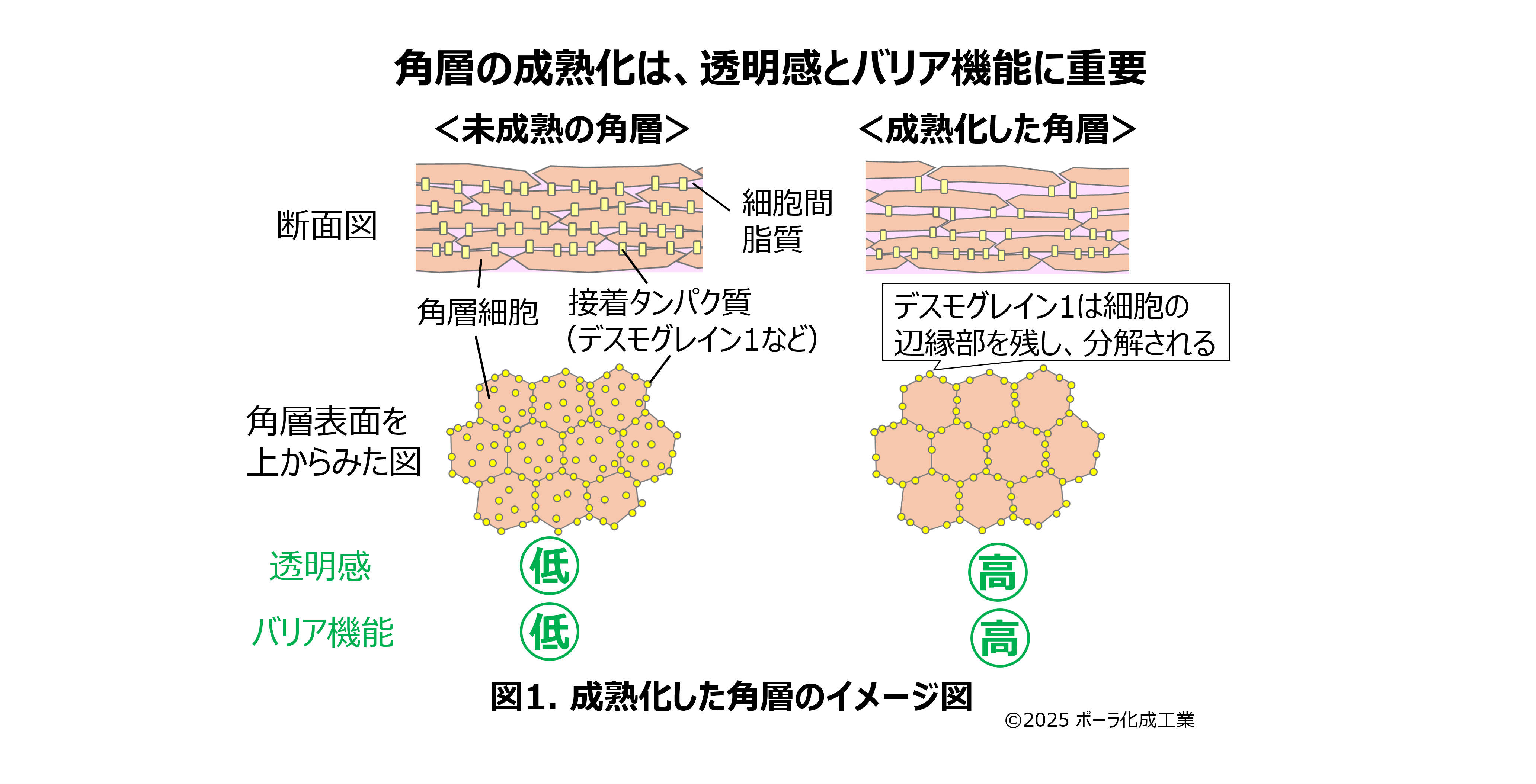 ポーラ化成工業では、「角層の成熟化」についての研究を長年続けており、肌の柔軟性との関連など、さまざまな新知見を発表してきた。特に2016年には、角層の成熟化度合いと肌の明るさの指標(L*値)に相関関係があることや、成熟化した角層は、そうでない角層に比べて、光の散乱性が高いことを発表している。このことから、角層の成熟化は、肌の透明感とも関連性があることが考えられる。