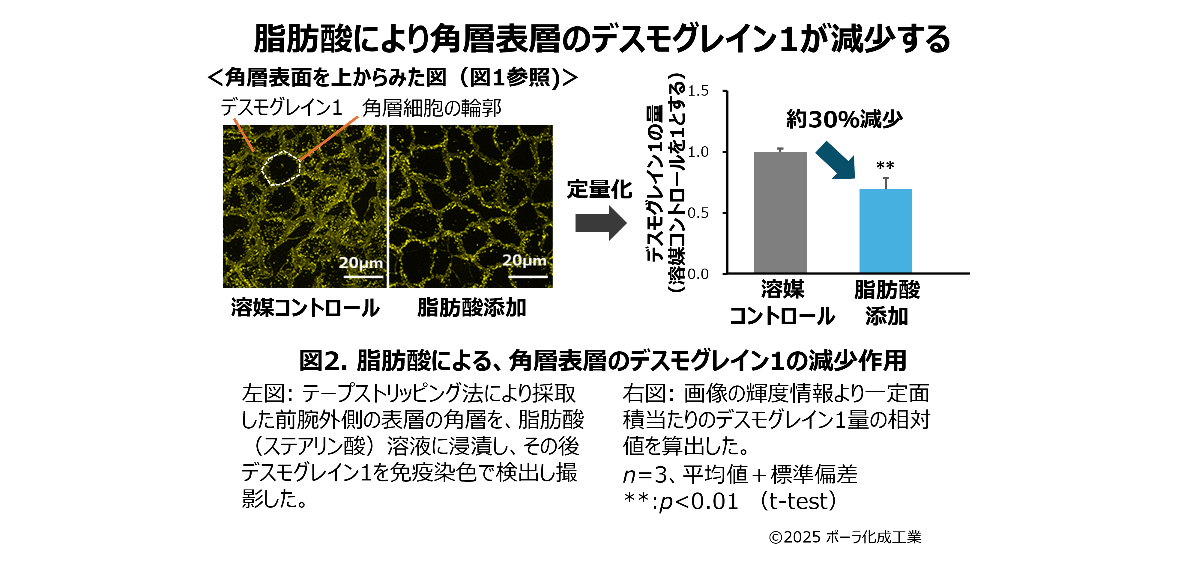 一方、細胞間脂質の主要成分には「脂肪酸」が含まれるが、「角層の成熟化」には、脂肪酸が重要との仮説を設定し、その働きを調べた。