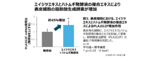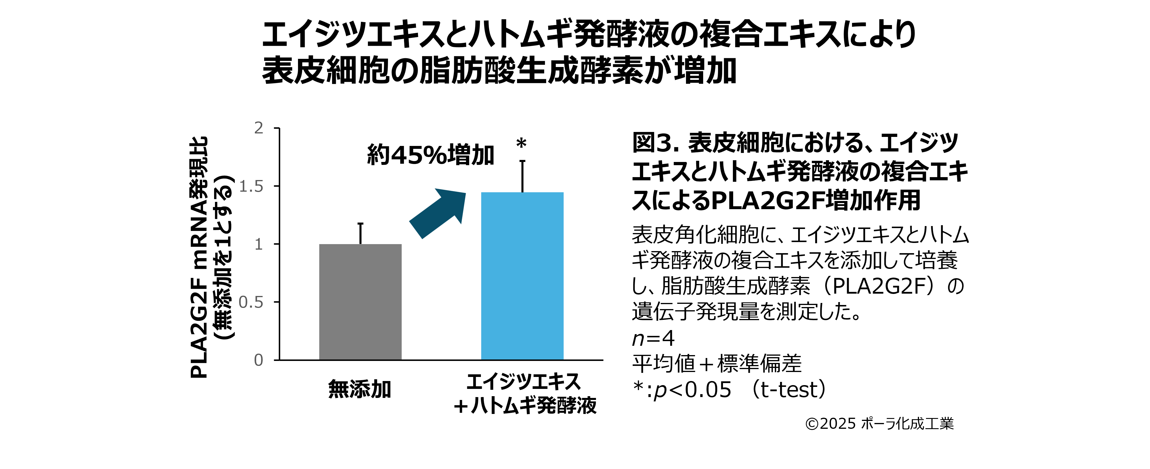 毎日の洗顔などで、細胞間脂質は少しずつ失われてしまう。中でも脂肪酸は特に失われやすく、その生成を促すことは角層を健やかに保つ上で重要だ。そこで脂肪酸を生成する酵素であるPLA2G2F(Phospholipase A2 Group IIF)を増加させるエキスを探索し、エイジツエキスとハトムギ発酵液の複合物に、その作用があることを見いだした(図3)。