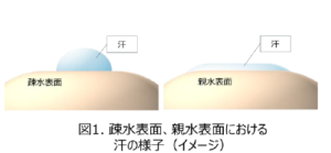 ヒトの肌は疎水的なため、汗が滴状になり、ぬれ広がりにくい性質がある(図1)。そこで花王は、肌の上に汗となじみやすくなる膜を作れば、出てきた汗が肌上ですばやく広がり、蒸散スピードを促進できるのではと考えた。
