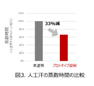肌に見立てた人工皮革を用いて、汗のぬれ広がる表面積を広くすると、速く乾きやすくなるかどうかを確認した。親水性板状粉体と多孔質シリカを配合したプロトタイプ製剤を人工皮革に塗布し、その上に人工汗(水に塩化ナトリウムや乳酸を加えた溶液)を噴霧して、蒸散するまでの時間を測定(30℃湿度60%の暑熱環境下で人工汗が60%蒸散するまでの時間を測定)した。その結果、プロトタイプ製剤を塗布した人工皮革での蒸散時間は、未塗布と比べて約33%短くなることが確認できた(図3)。