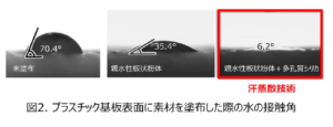 親水性の膜をつくる素材を探索するため、さまざまな素材をプラスチック基板に塗布し、水を滴下して30秒後の接触角を測定する実験を行った。接触角が小さいほど、基板表面に水がぬれ広がりやすくなっていることを示す。その結果、特定の親水性板状粉体を塗布すると、滴下した水の接触角が小さくなることが確認できた。また、特定の親水性板状粉体と多孔質シリカを組み合わせると、接触角はさらに小さくなり、水がすばやくぬれ広がることが分かった(図2)。