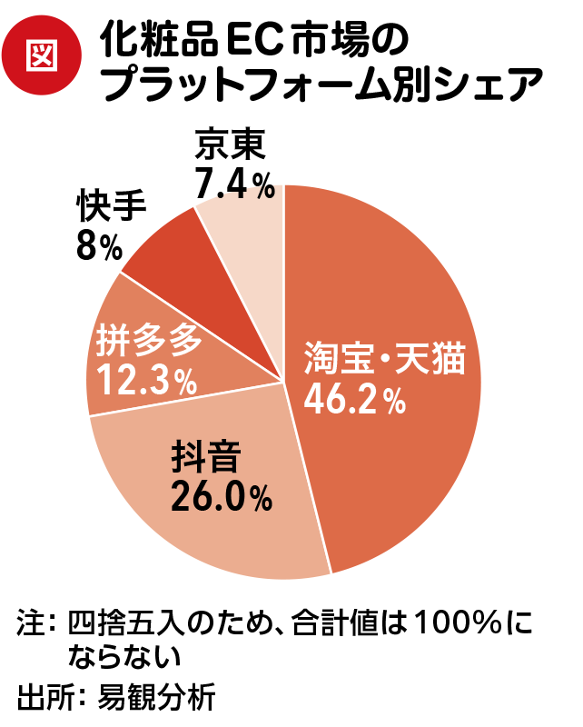 「易観分析」の統計によると、W11期間中の主要ECプラットフォームの市場シェアとして、「淘天(淘宝と天猫)」が最も高い50.1%となっており、次いで、京東(18.9%)、抖音(14.8%)、拼多多(12.2%)、快手(3.9%)となる。また、W11セール第1週(10月15〜21日)における化粧品EC市場のプラットフォーム別シェアを見ると、淘宝・天猫だけで46.2%のシェアを占めており、次いで抖音(26.0%)、拼多多(12.3%)、快手(8%)、京東(7.4%)の順となる。淘宝・天猫は中国EC業界におけるトップの地位を保っている。〈図参照〉