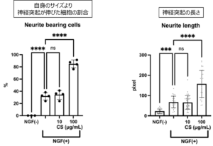 PC12細胞に対する神経突起進展への影響を調査した試験ではラット副腎褐色細胞腫由来PC12細胞に神経成長因子(NGF)と冬虫夏草のエタノール抽出物(0、10、100ミリグラム/ミリリットル)を作用させ、神経突起伸長を誘導した。分化誘導5日目の分化した細胞数の割合(左グラフ)と神経突起の長さ(右グラフ)を定量化した。冬虫夏草(CS)抽出物100ナノグラム/ミリリットル投与群では分化細胞数と神経突起長が有意に(p<0.0001)増加しており、冬虫夏草による神経分化促進作用が示された(三重大学実施)。