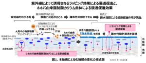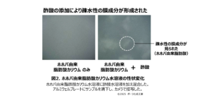 脂肪酸カリウムは水に溶けやすい性質を持つが、このように弱酸性の環境下では脂肪酸に変化し水をはじくようになる。これを利用すると、サンスクリーンの塗布により肌上に形成した膜にUVが当たることで脂肪酸が水に強い疎水性の膜となりフタのような役割を果たすことでうるおいを閉じ込める機能を高めることができるのではないかと考えた。