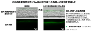 ホホバ由来脂肪酸カリウムによる角層への水溶性成分の浸透促進効果を確認した。三次元培養表皮モデルを用いて、化粧品成分に見立てた水溶性蛍光物質の浸透性を調べた結果、ホホバ由来脂肪酸カリウムにより角層への物質の浸透が促進されることが確認された(図4)。