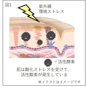 日常では紫外線や環境ストレスによって肌は酸化ストレスを受けている。このストレスから肌を守るには、二つの仕組みが重要だ。一つは、発生したばかりの活性酸素をすぐに取り除く「即効性」の高い直接的な抗酸化作用で、アスコルビン酸が代表的だ。もう一つは、表皮細胞のスイッチ「NRF2」に働き、抗酸化酵素を増やすことで細胞そのものの防御力を高める、「持続性」の高い細胞内の抗酸化作用である。