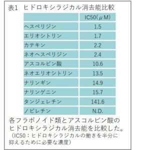 そこで、数多くあるフラボノイドの中から、ヒドロキシラジカルを効果的に除去できるものを見つけるために、発生させたヒドロキシラジカルを各フラボノイドと混合し、ラジカルがどれだけ減少するか測定する試験を実施し、比較研究を行った(表1)。