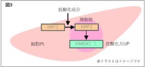 NRF2(Nuclear factor-erythroid 2-related factor 2)は、細胞が酸化ストレスから自らを守るために働く“防御スイッチ”のような存在。転写因子と呼ばれるタンパク質で、普段は細胞質の中で抑えられているが、抗酸化成分をきっかけに活性化すると核内に移動し、抗酸化酵素や解毒酵素をつくる遺伝子をオンにする(図3)。