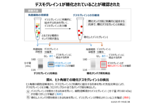 研究では、生体内で角層のデスモグレイン1が糖化されていることを直接的に検証した。ヒトの角層細胞を溶かした液から、デスモグレイン1を分離した。次に、デスモグレイン1の分離液を用いて、糖化したタンパク質を検出する試験を行ったところ、糖化の反応が確認された(図4)。このことから、ヒト角層でデスモグレイン1が糖化されていることが示唆された。