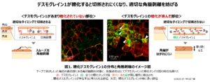 このことから、コルネオデスモソームも糖化され、切断されにくくなる可能性があると考えた。研究の結果、角層のコルネオデスモソームの主要構成因子「デスモグレイン1」が、生体内で糖化されていることが観察され、糖化したデスモグレイン1は、角層の表層から深くまで広く存在することが明らかになった。
