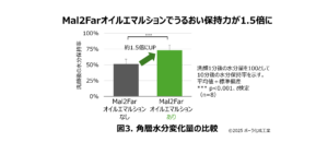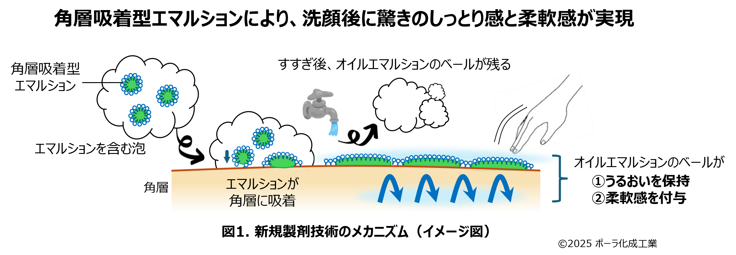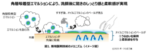 同研究では、うるおい実感をさらに向上させようと、「Mal2Far」でエモリエントオイルを乳化し、洗顔料に配合する新技術(角層吸着型エマルション)を開発した。すすぎ後も肌にエマルションのベールが残ることで、驚くほどのしっとり感や柔軟感を与える(図1)。