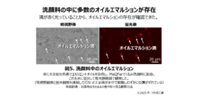この洗顔料を水に溶かし顕微鏡で観察すると、エマルションの滴が多数存在する様子を見ることができた(図5)。これにより、洗顔料中にエマルションとして安定して配合できていること、水が混ざったあとも崩壊せずに存在することが確かめられた。