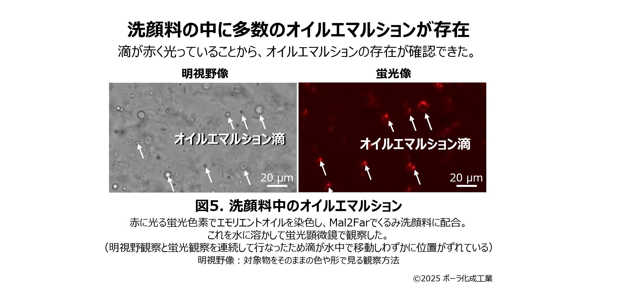 洗顔料の中にエマルションが存在しているか、また洗浄後に角層に吸着するかを検証するため、赤の蛍光色素で染色したエモリエントオイルを「Mal2Far」でくるんだエマルションを洗顔料に配合した。