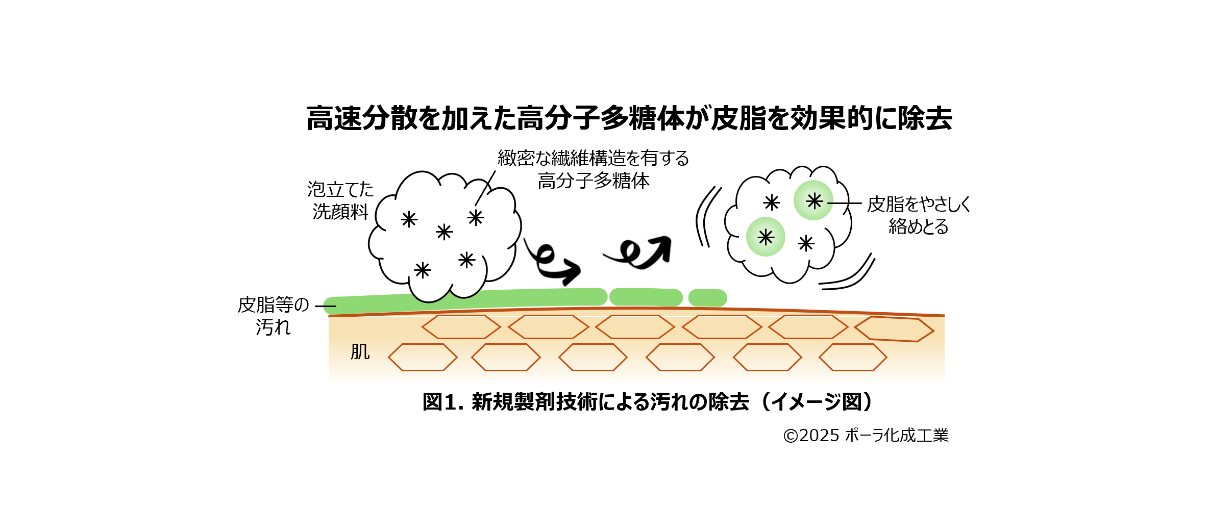 ポーラ・オルビスグループの研究・開発・生産を担うポーラ化成工業は、天然保湿成分である高分子多糖体を用いた、肌に優しい新しい洗顔料の技術を開発した。その秘密は、この天然成分を従来よりも高速で液中に分散させることで生まれる、きめ細かい繊維ネットワーク構造だ。このネットワークはミクロなスポンジのように働き、余分な皮脂や汚れを優しく効率的に絡め取る(図1)。