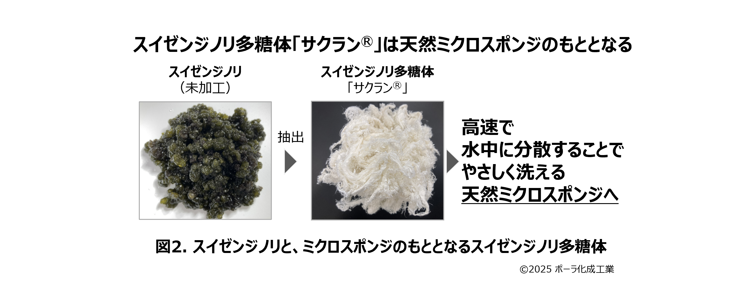 熊本阿蘇地域に生息する日本固有の淡水性ラン藻「水前寺海苔(スイゼンジノリ)」からは、「サクランⓇ」と呼ばれる多糖体(図2)が抽出できる。分子量は2900万にも上り、化粧品に使われる高分子多糖原料の中でも極めて大きく、ふわふわとしたやわらかなボディスポンジのよう。水に溶かすととろみが出て、水分を多く保持できるため、保湿剤としても活用されている。