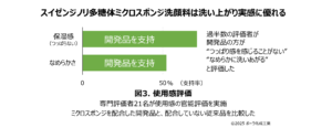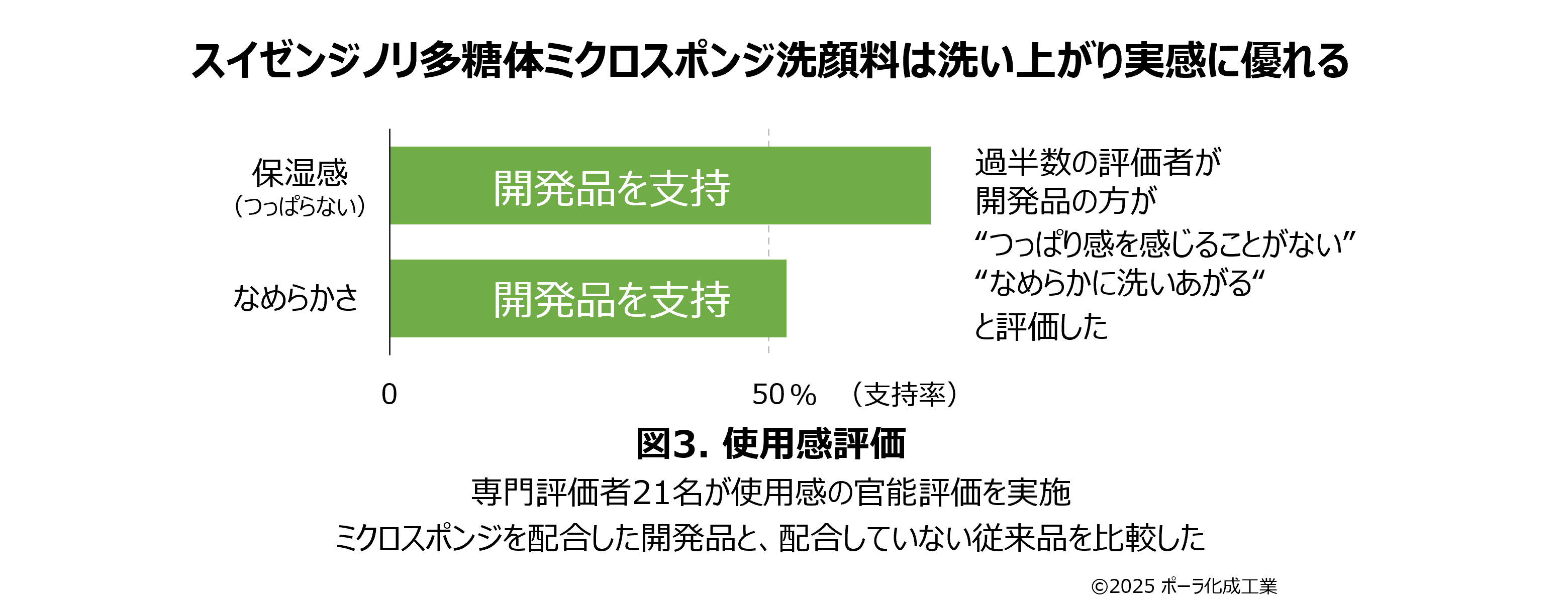 またこれを配合した洗顔料は、官能評価で洗い上がりの良さを支持する割合が高いことが確認された(図3)。これはスイゼンジノリのきめ細かい繊維ネットワークがミクロのスポンジとしてうるおいを守りながらやさしく汚れをキャッチしてくれている作用だと考えられる。
