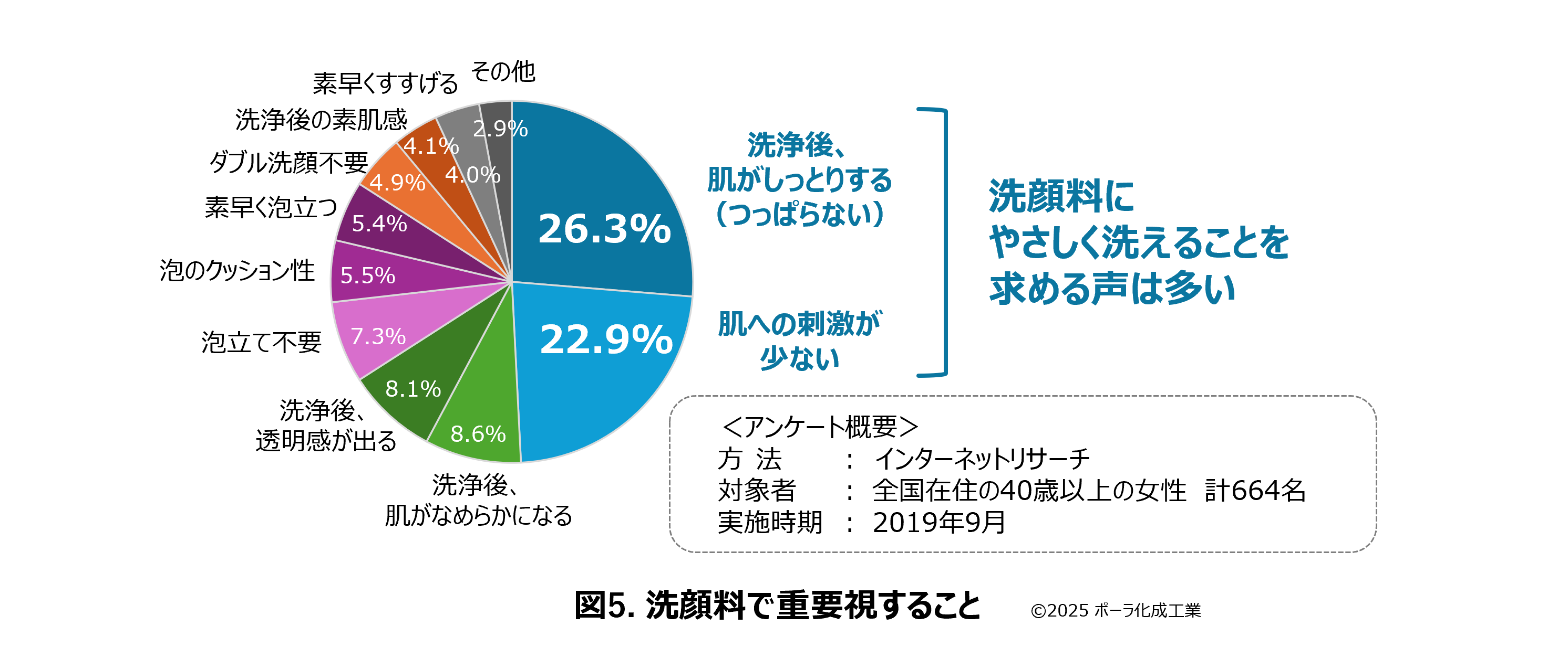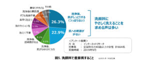 洗顔料には、豊かな泡でしっかり汚れを落とすだけでなく、肌をやさしく洗いたいといった声が多い。一般消費者を対象に実施した洗顔料に関する同社アンケート調査では、洗顔料に対し、泡質や後肌実感などの機能面に加え、肌への刺激が少ないことを望む人が多いことが確認された(図5)。